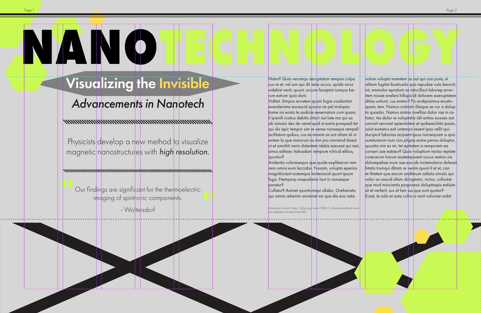 Created a 8.5 x 17 inch magazine spread on Nanotechnology that balances a striking, hand-rendered header with a simple yet robust layout, complemented by thematic vector elements and brought together by a contemporary, science-oriented color palette designed for visual appeal and cohesion.